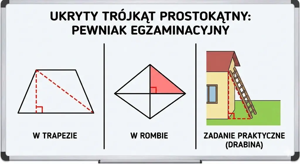 W geometrii na egzaminie ósmoklasisty prawie zawsze pojawia się trójkąt prostokątny. Może być ukryty w trapezie, rombie albo w zadaniu praktycznym.